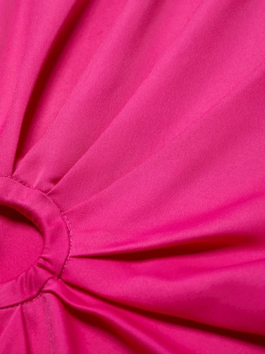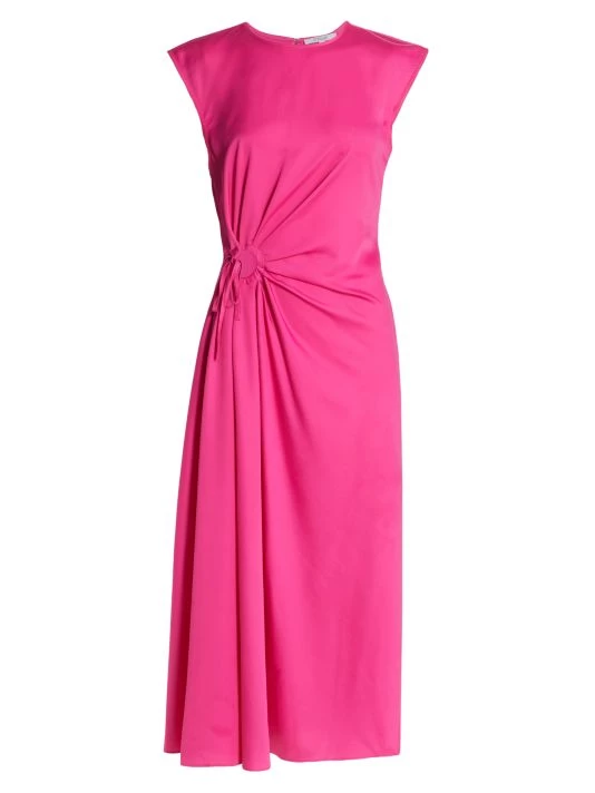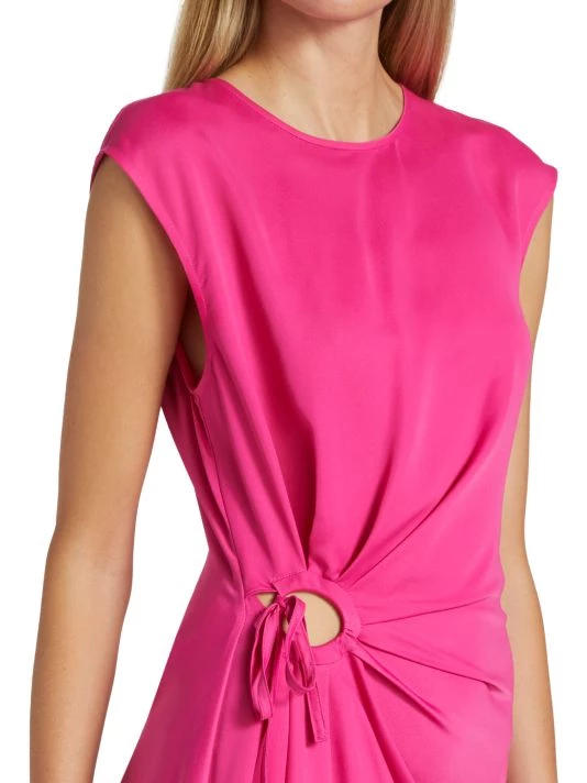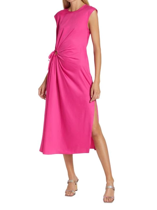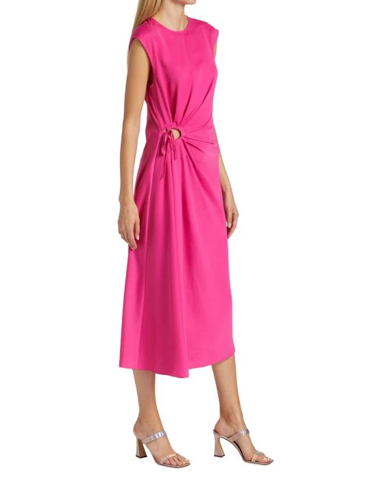 Sleeveless midi-dress with gathering at adjustable self-tie keyhole waist cutout.