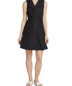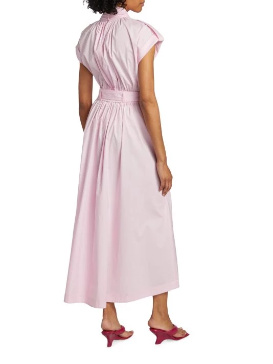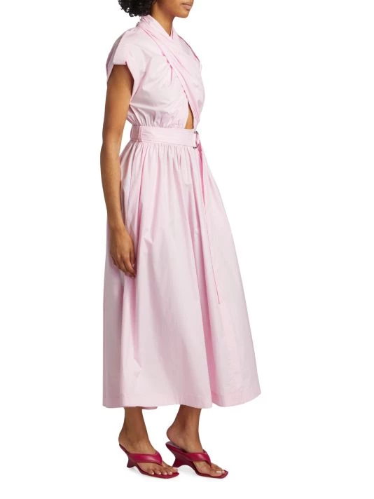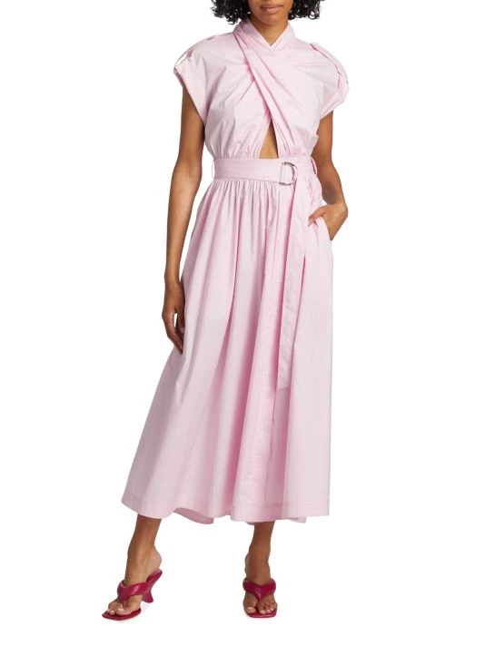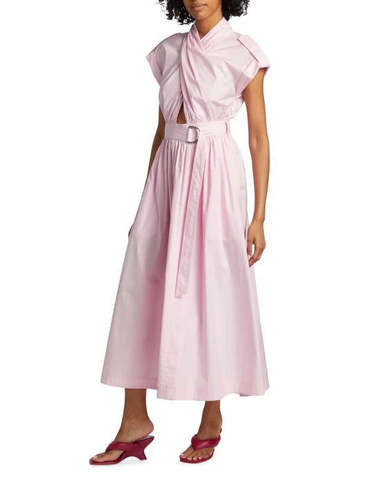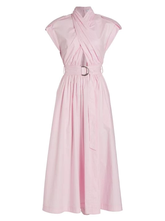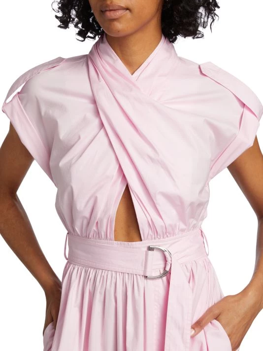 The Celeste midi-dress from Derek Lam 10 Crosby features a wrap-front bodice with a center cutout. Short sleeves with epaulets and a matching D-ring belt complete this A-line style.