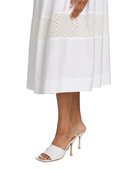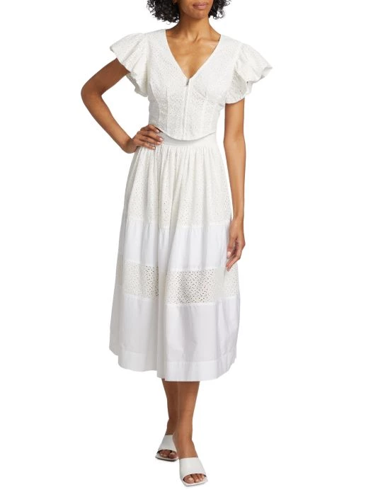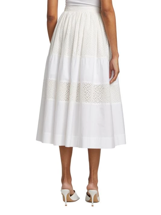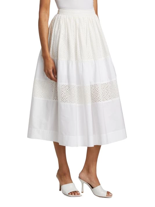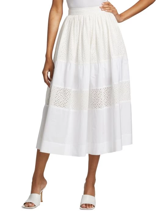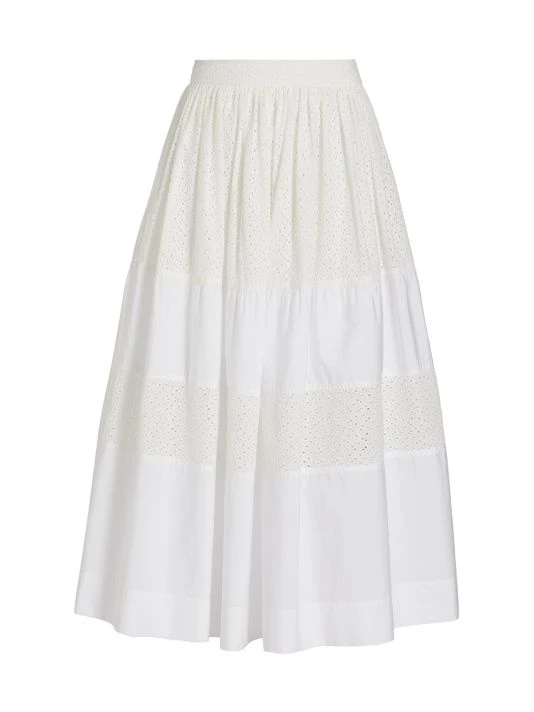The Danna midi-skirt from Derek Lam 10 Crosby features a high-waisted, full A-line silhouette. Tiers of eyelet lace and cotton poplin define this airy style.