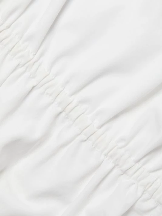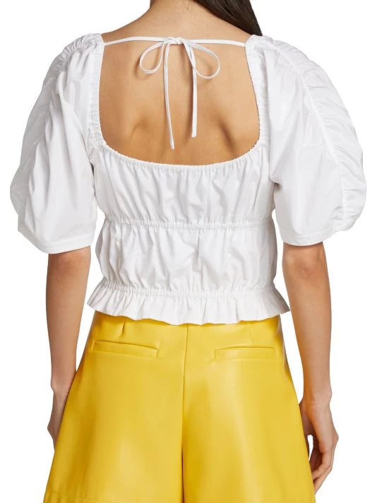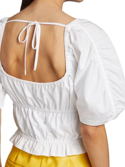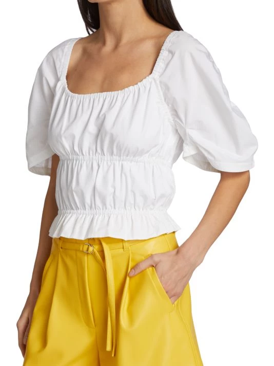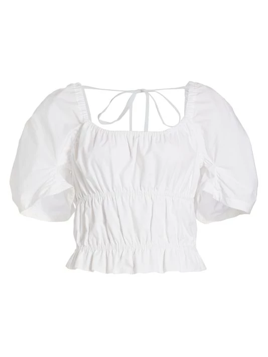 This cotton blouse is designed with puffed sleeves and a ruched waist.