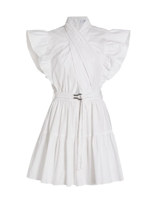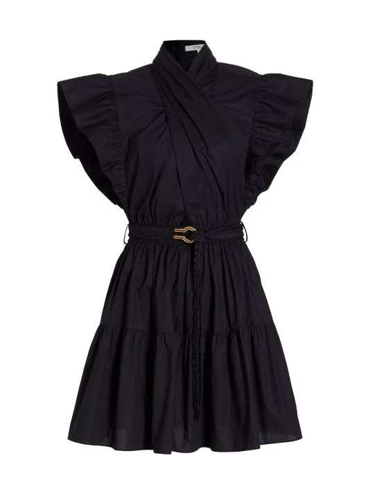 The Finn minidress from Derek Lam 10 Crosby features a wrap-front bodice with a center cutout and ruffled short sleeves. A braided belt finishes this tiered A-line style.