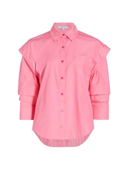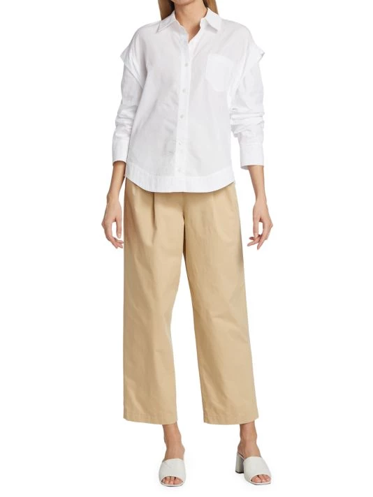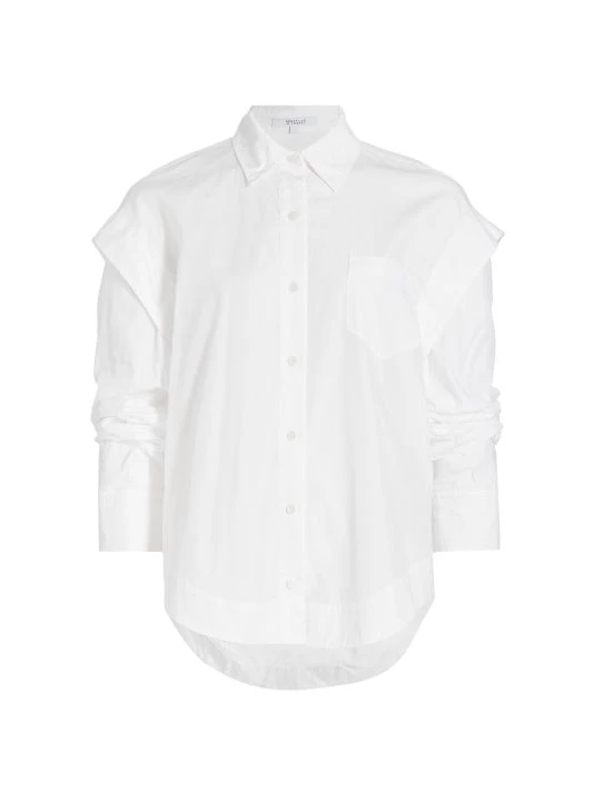 Crafted of crisp cotton poplin, this tailored shirt is framed by statement sleeves with ruched detailing. This style features classic touches like a patch pocket at the chest and curved hem.