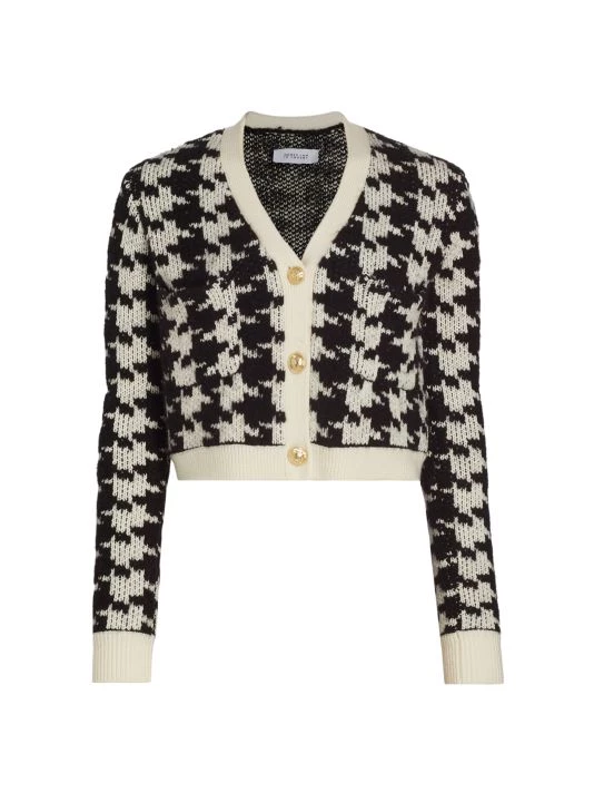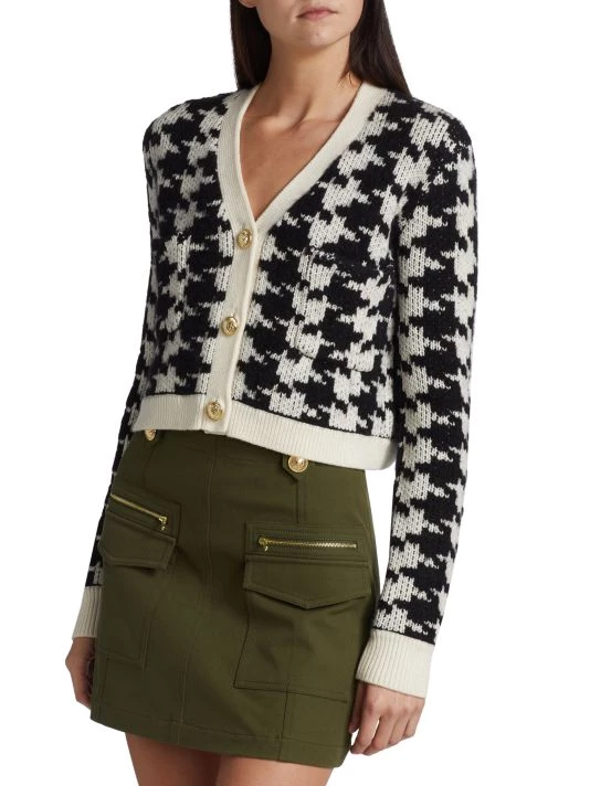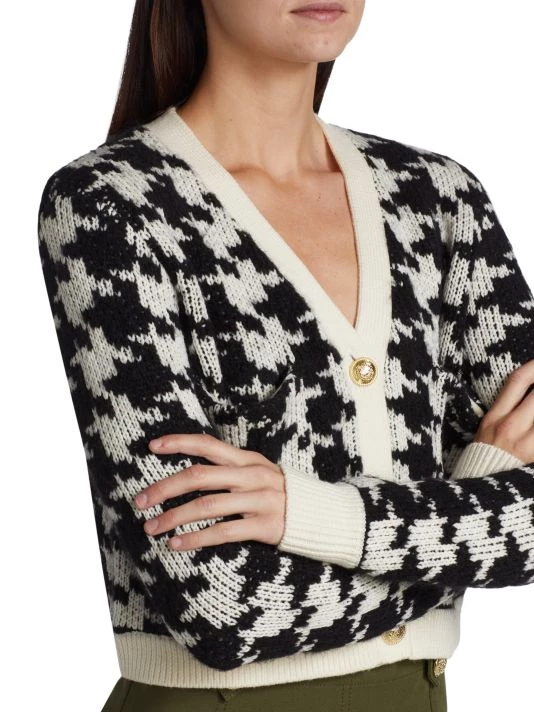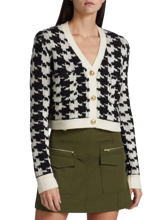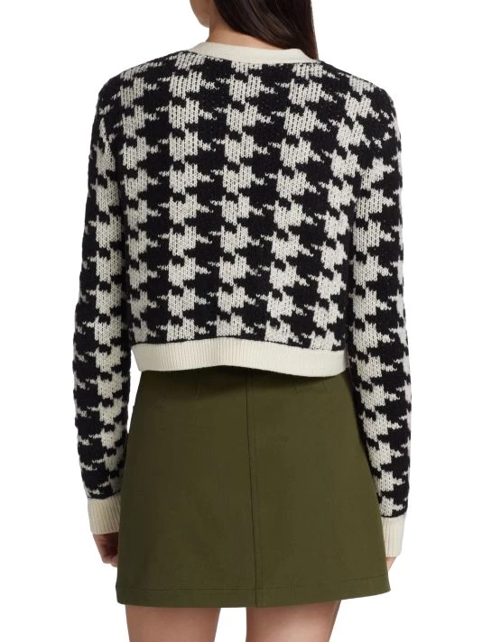 Decorated with a houndstooth pattern, Derek Lam 10 Crosby’s Molly wool-blend crop cardigan features a V-neck, long sleeves, and dual patch pockets at the front.