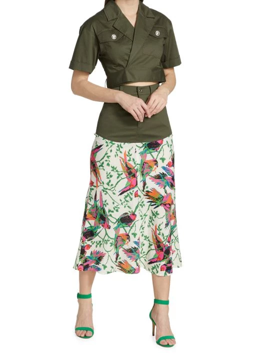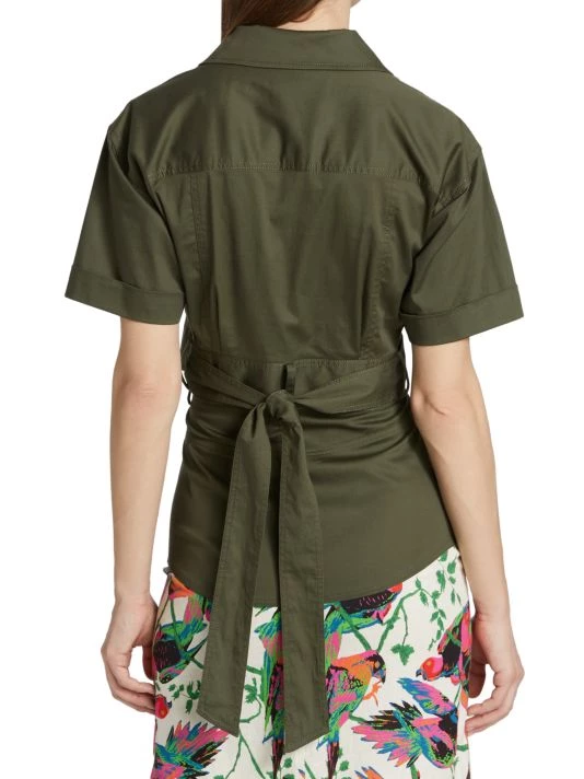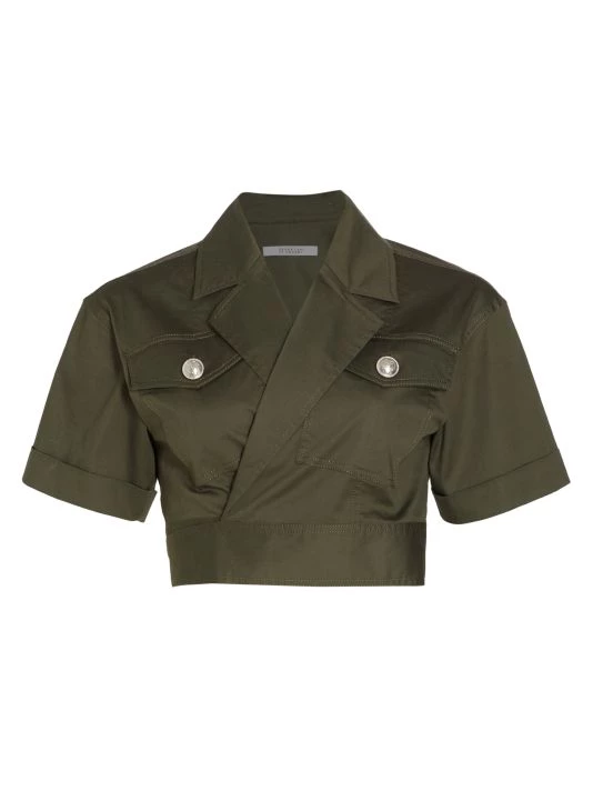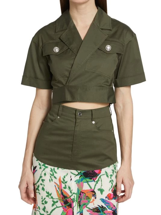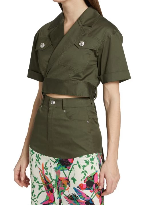 Derek Lam 10 Crosby’s Ragean crop top evokes a military design, showcasing notch lapels and sharp tailoring. Finished in a flattering wrap fit, this style cinches with a back self-tie creating a tapered silhouette.