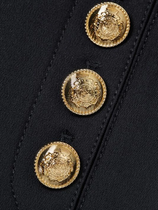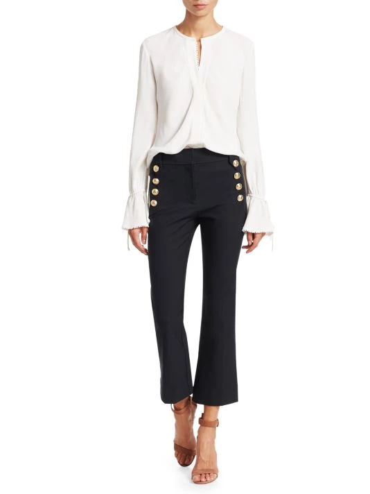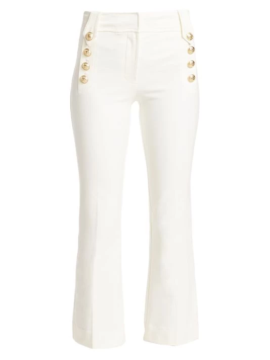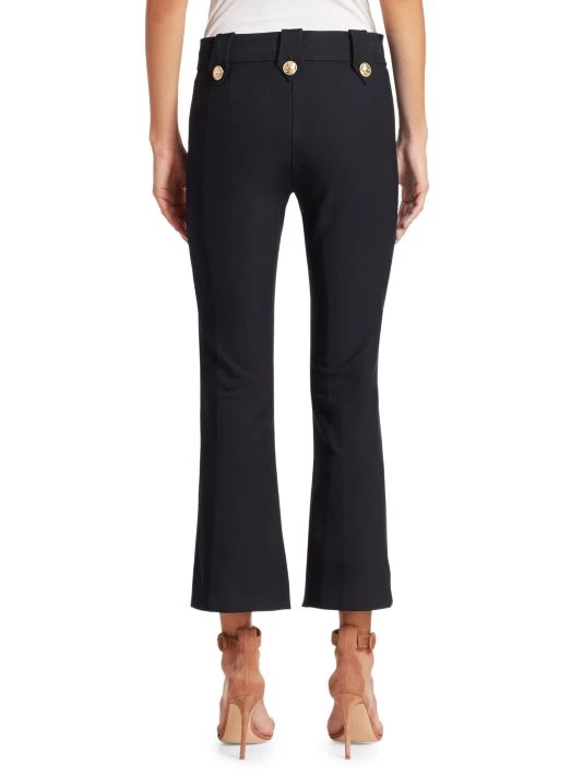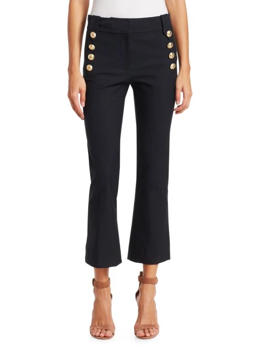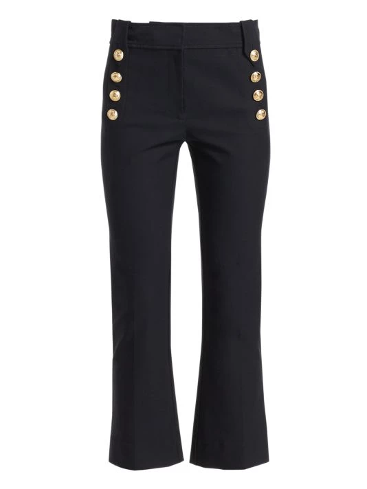 Rows of goldtone buttons add a sailor aesthetic to these kick-flare trousers.
