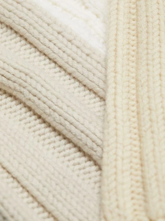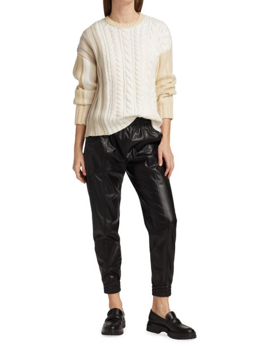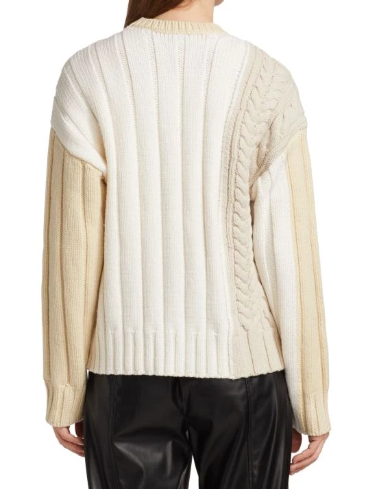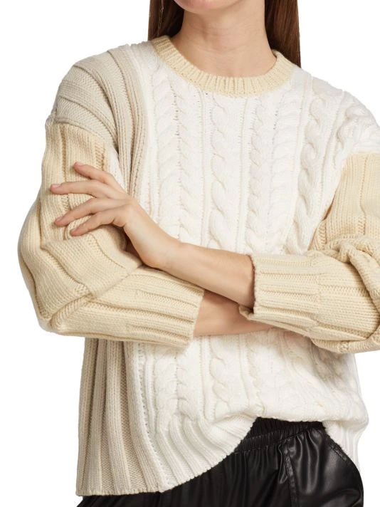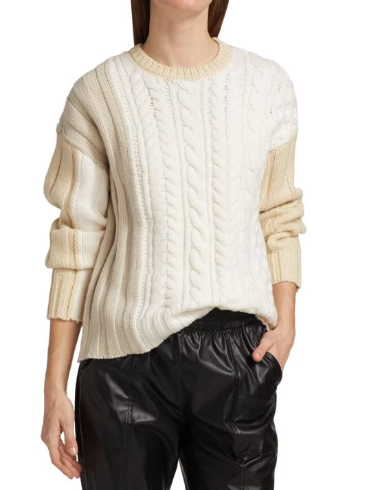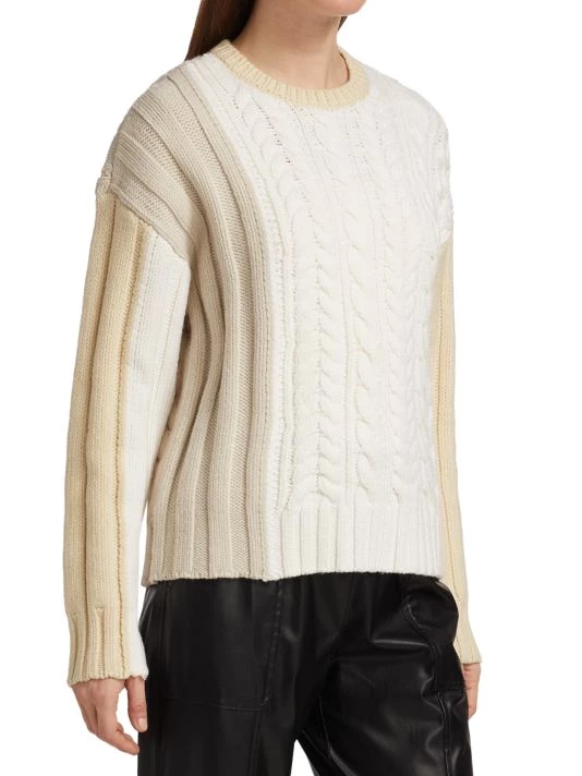 This wool sweater features cable-knit detailing throughout, finished with contrasting detail at the sleeves.