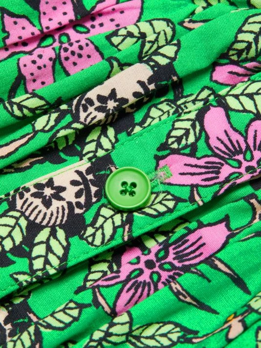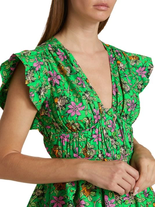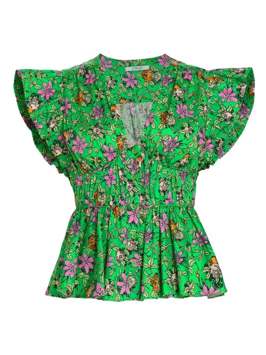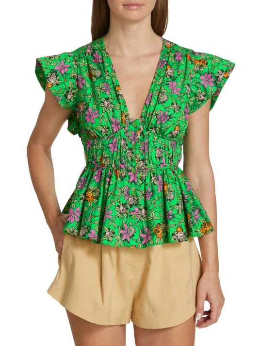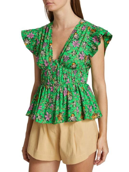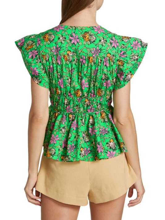 Bright florals cover Derek Lam 10 Crosby’s Roselyn top, designed with gathered pleating and feminine ruffle sleeves.