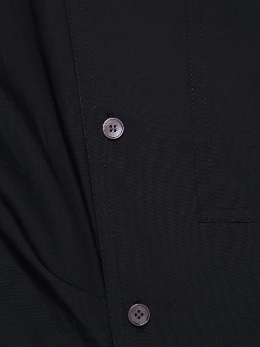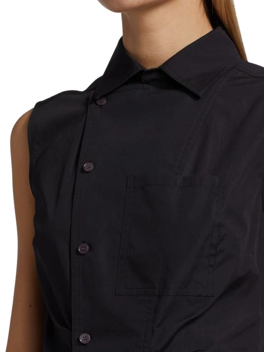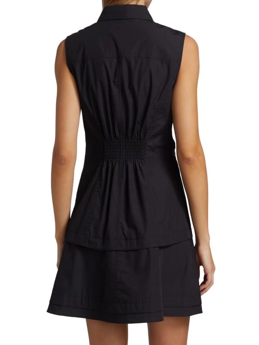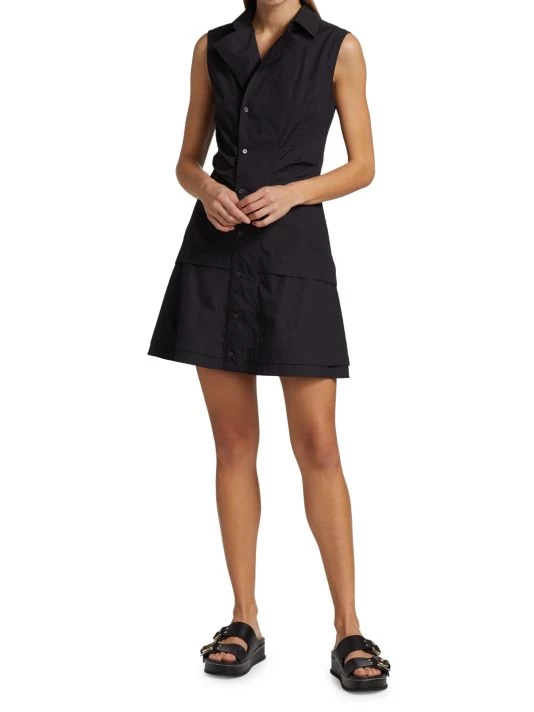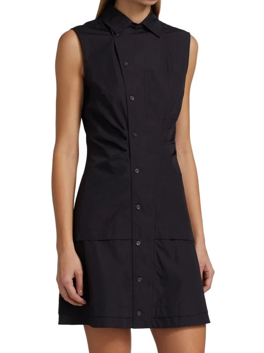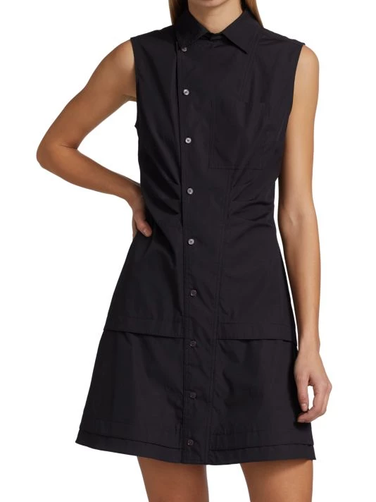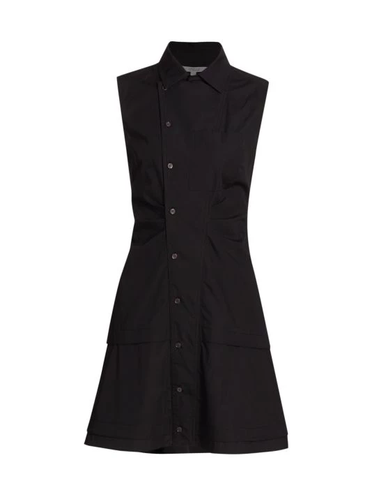 Classic tailoring reimagined–an asymmetric button folds out into a wide notched collar on this crisp cotton fit-and-flare dress.