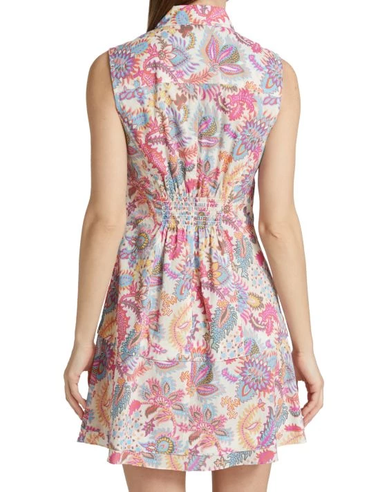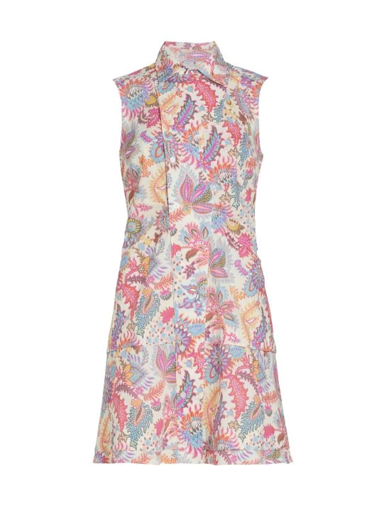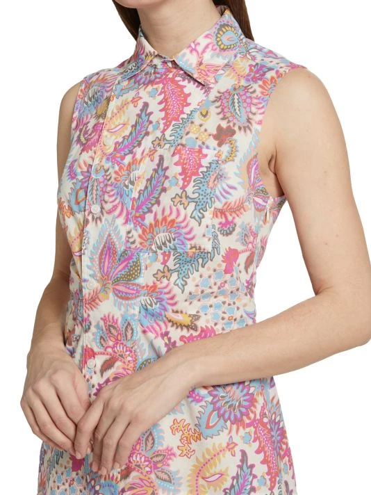 Featuring a bright paisley print, this sleeveless mini-length shirtdress from Derek Lam 10 Crosby is accented with a notch collar and a concealed button-front closure.