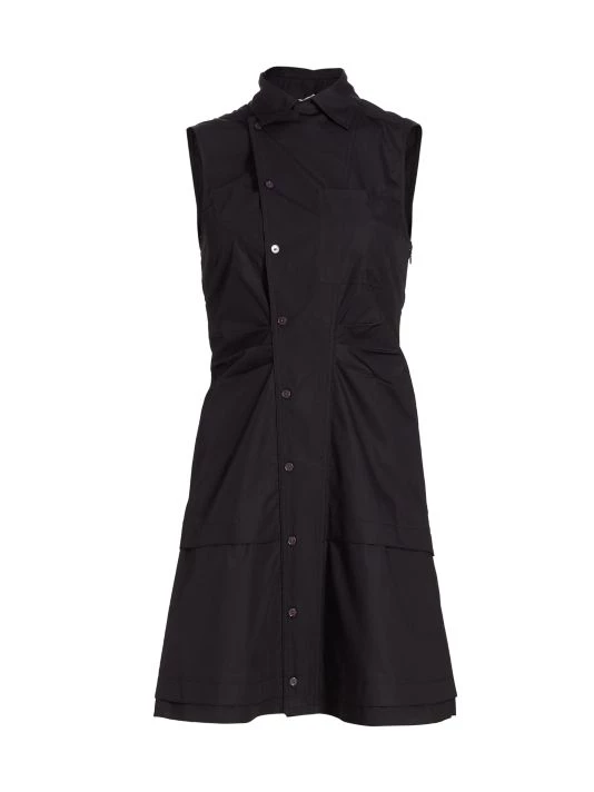 Cut in a shirt-inspired silhouette, this sleeveless poplin minidress offers a tiered skirt.