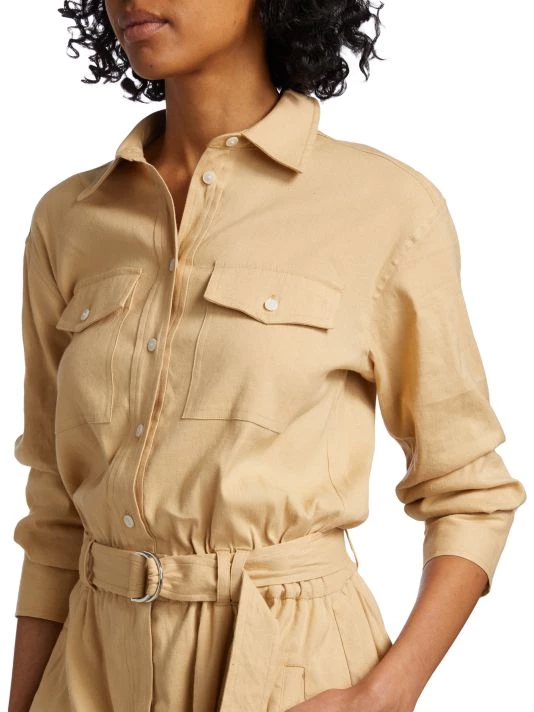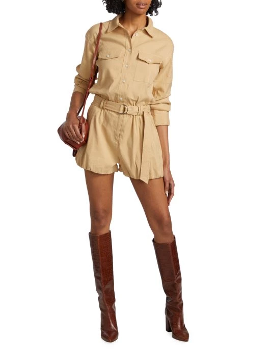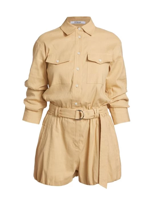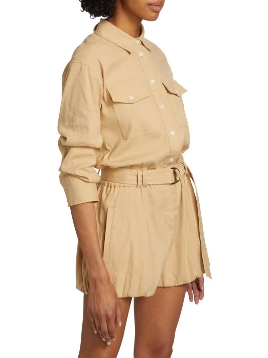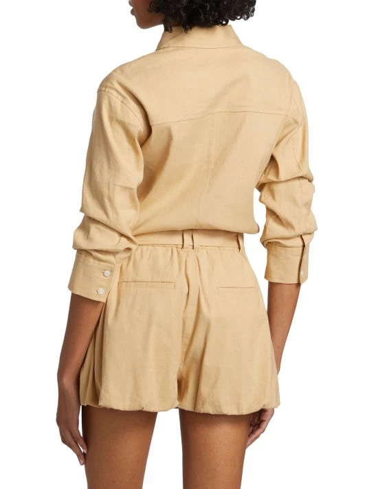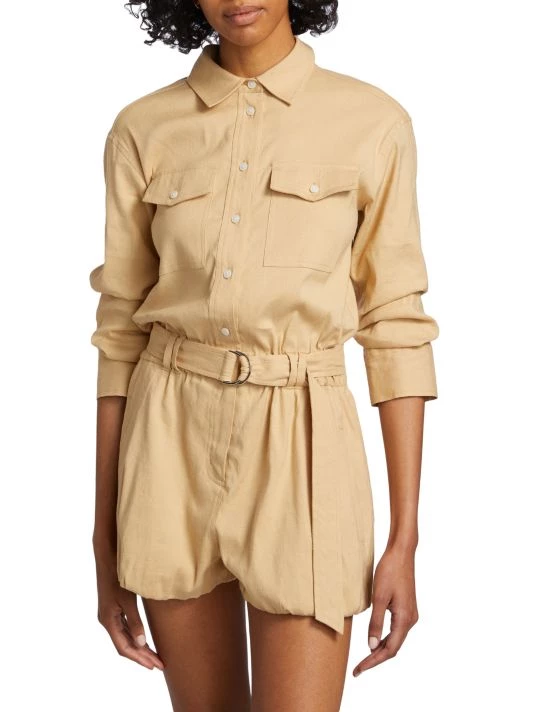 The Zuma jumpsuit from Derek Lam 10 Crosby features ruched three-quarter-length sleeves and ballon-style hems. A matching D-ring belt completes this button-front style.