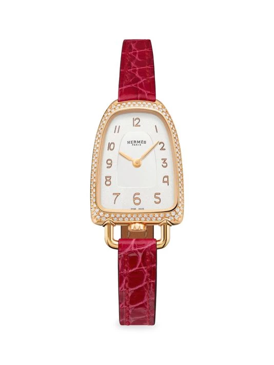 From the Galop d’Hermès Collection. Diamond pavé adds glitter to this refined alligator-strap timepiece.