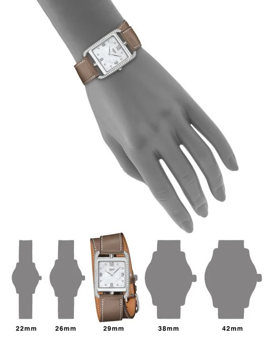 - Interchangeable double wrap-around etoupe calf strap, 19mm x 17mm (0.75″ x 0.67″ )