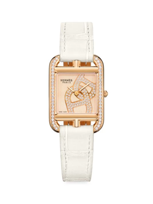 Featuring the label’s iconic Chain d’Ancre motif encrusted with white diamonds at the dial, this exquisite watch boasts a square diamond-studded 18K rose gold case and white alligator leather strap.