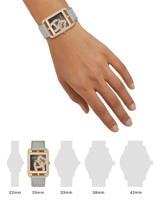 Featuring the label’s iconic Chain d’Ancre motif encrusted with white diamonds at the dial, this exquisite watch boasts a square diamond-studded 18k rose gold case and grey alligator leather strap.