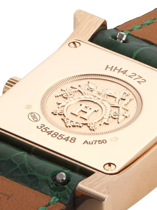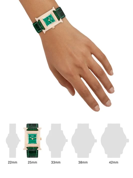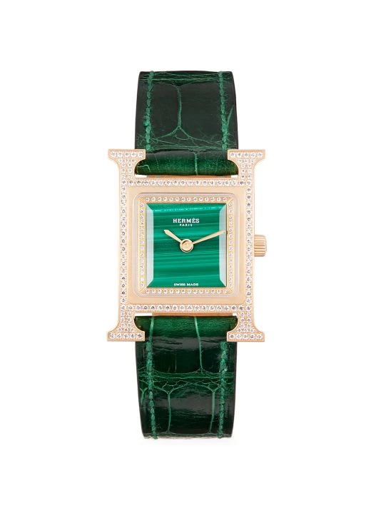 From the Heure H Collection. This diamond-set rose gold watch from HERMÈS is finished with a smooth alligator strap and a diamond-set malachite dial.