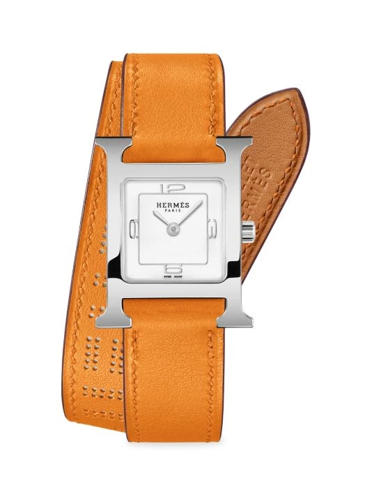 From the Heure H Collection. Signature H-shaped stainless case set on a grained orange leather wraparound strap.