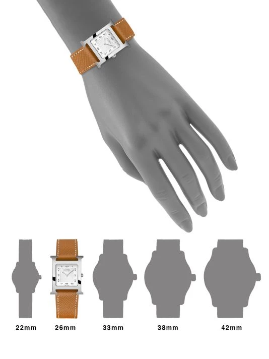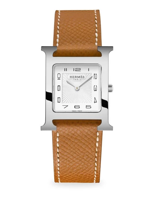 - Lustrous H-shaped case on smooth gold-grain leather strap