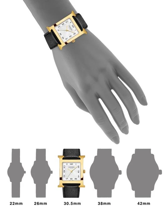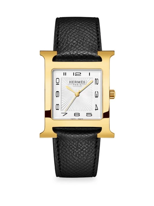 From The Heure H Collection. Signature H-shaped goldplated stainless steel case set on an interchangeable leather strap.