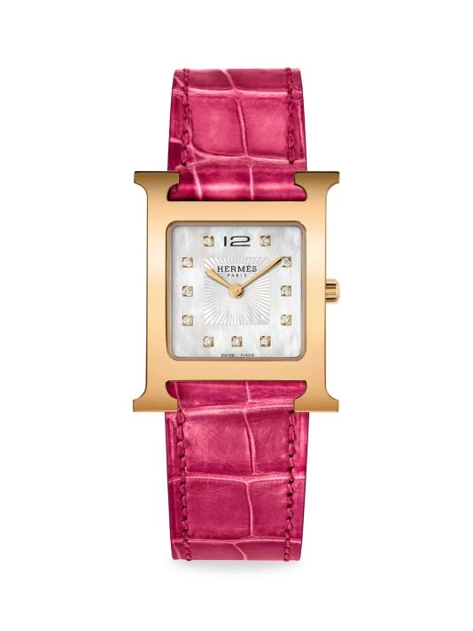From the Heure H Collection. Signature H-shaped rose goldplated steel case with diamond-set dial on an opulent polished raspberry alligator strap.