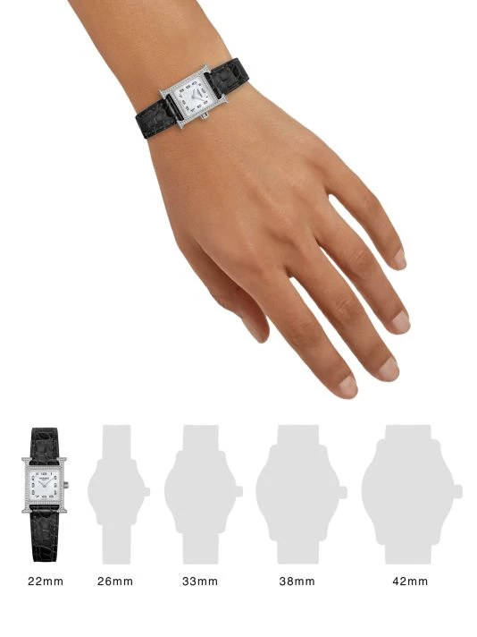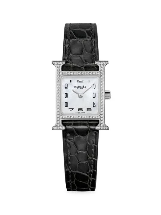 From the Heure H Collection. Signature H-shaped steel case highlighted with sparkling diamonds on an opulent matte black alligator strap.