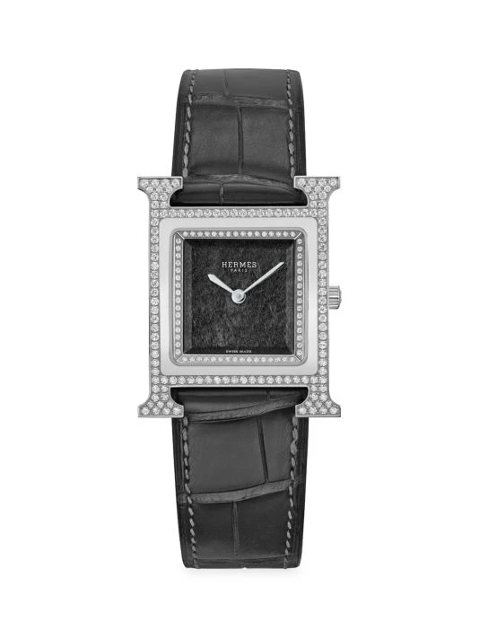 From the Heure H Collection. An obsidian dial centers this signature timepiece with an alligator band, H-shaped case and sparkling diamond pavé.