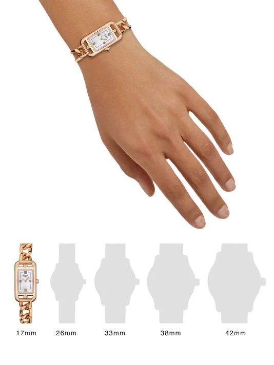 - 18K rose gold rectanglular case, 17mm x 23mm (0.67″ x 0.91″)